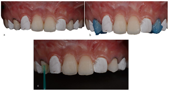 (a) Isolation of adjacent teeth with polytetrafluoroethylene tape and the placement of gingival retraction cords. (b) Phosphoric acid attack. (c) Application of the adhesive system.