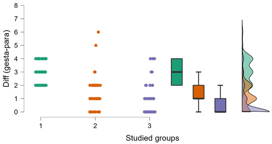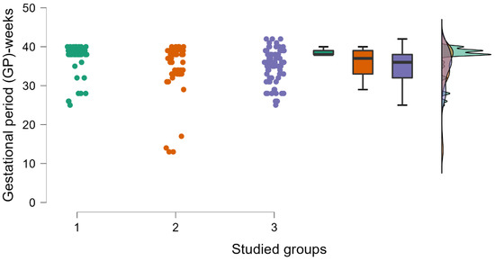 The gestational period is presented in three studied groups, using raincloud plots (in this type of graphical representation, we can see a complete data distribution, by density and by box plots). In group 1, the GP was significantly higher (p = 0.032 < 0.05, p value obtained from Kruskal–Wallis test; groups 1 and 2 contain 51 patients each, group 3 contains 76 patients).