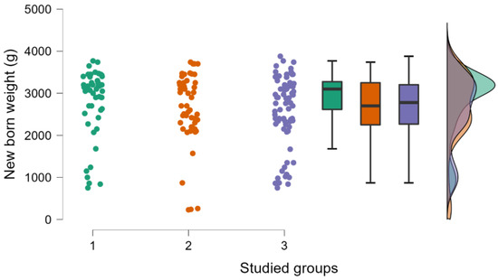 The newborn weight is presented in three studied groups, using raincloud plots; there were no statistically significant differences between the studied groups (p > 0.05, p value obtained from Kruskal–Wallis test; groups 1 and 2 contain 51 patients each, group 3 contains 76 patients).