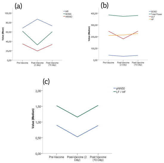Heart rate variability (HRV) is thought to be an accurate and non-invasive way to measure the sympathetic and parasympathetic parts of the autonomic nervous system. A reduction in HRV, a strong indicator of autonomic function, is closely associated with mortality. It is also known that both acute and chronic inflammation are likewise closely related to autonomic dysfunction [6,7,8,9,10,11]. Moreover, it has been shown that autonomic dysfunction is involved in subclinical inflammatory processes [12]. A limited number of studies that investigated the effects of an inflammatory response to vaccination have reported autonomic tone changes secondary to the low-grade inflammation [13]. The effect of mRNA vaccines, developed using state-of-the-art technologies, on autonomic function, is not fully known.