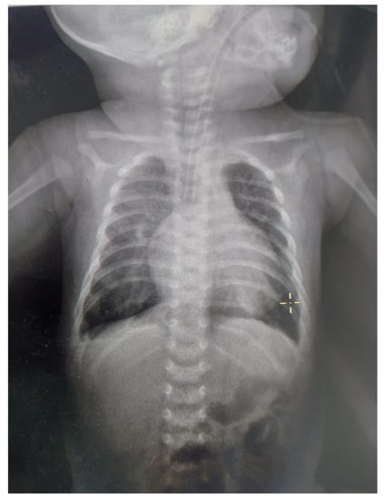 Another cause for respiratory distress in newborn babies is infection. Patients with cardiac failure can have recurrent respiratory infections [,]. Ventilation pneumonia is a common occurrence in infants that require intubation and mechanical ventilation for a large amount of time. It is usually considered a nosocomial infection and definitive diagnosis criteria include: more than 48 h of mechanical ventilation; changes in blood gases; a need to increase ventilation parameters; temperature instability; tachypnea, wheezing, cough, or abundant secretions; changes in cardiac rhythm; and leukocytosis. Three signs or symptoms from those listed above are necessary to diagnose ventilation pneumonia []. Our patient had clinical criteria for ventilation pneumonia and needed prolonged mechanical ventilation.
