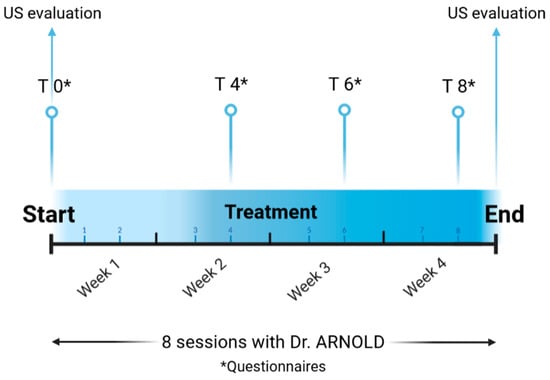 Study Timeline. Every subject was treated for a total of 8 sessions, with two sessions per week. Eight questionnaires (*) were provided at different time points (baseline T0, 4th session T4, 6th session T6, and 8th session T8). The US measurements were performed at baseline and at the end of the treatment course.