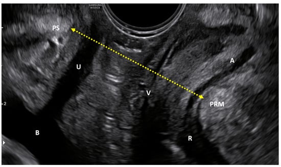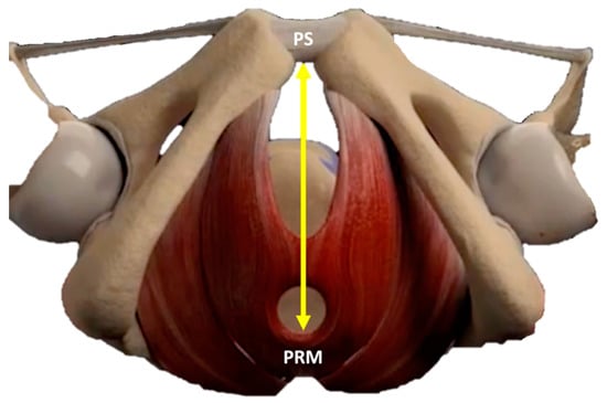 The anatomical distance between the medial edge of the levator ani (puborectalis muscle—PRM) and the lower edge of the pubic symphysis (PS).