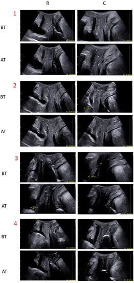 Ultrasound evaluation of four patients before (BT) and after (AT) the treatment with electromagnetic stimulation. For every subject, four pictures were taken. A comparison of a rest (R) condition and under stress/contraction (C) was made.