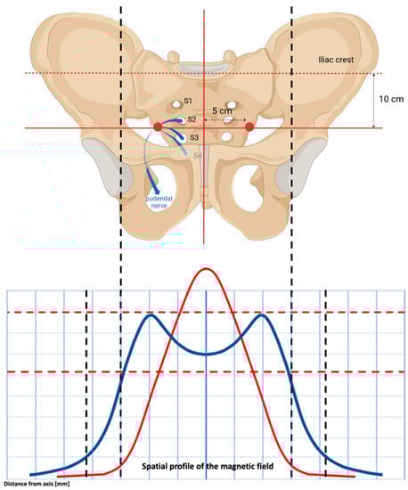 Spatial profile of magnetic field, which allows for a double dome distribution of electromagnetic energy. It intercepts the pudendal nerve at its exit point from the S2–S4 sacral roots. This way, the pudendal nerve is stimulated (as it is shown with red dots, around 10 cm below the iliac crests and 5 cm laterally shifted from the pelvis barycenter) thanks to the homogenous electromagnetic field characterized by a top-flat structure with a diameter of around 16 cm.