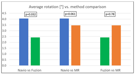 There were statistically significant differences in femoral component rotation between the groups (p = 0.0137). Post-hoc analysis showed a significant difference between the Fuzion and Navio groups (2.42 ± 2.87 vs. 4.05 ± 1.89, p = 0.0321) and an almost significant difference between the measured-resection and Navio groups (3.46 ± 1.86 vs. 4.05 ± 1.89, p = 0.0613), where a positive value indicates external rotation. The difference between the Fuzion and measured-resection groups was not statistically significant (p = 0.78).