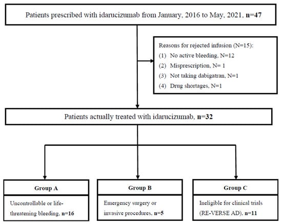 The inclusion criteria of our study were being more than 18 years old and receiving dabigatran. The only exclusion criterion was if patients did not actually receive the infusion following prescription. We enrolled all patients who were prescribed idarucizumab from when it became available in Taiwan, up until May 2021. Based on the inclusion criteria for the RE-VERSE AD trial, which can be retrieved from the study protocol of the trials, the potential trial eligibility of the individual patients who received idarucizumab was evaluated. This evaluation of eligibility was conducted by two independent reviewers (C.-H.W., J.-W.D.), whereby disagreements between the two reviewers were resolved in consultation with the senior author (S.-C.L.). We further divided all patients administered idarucizumab into three subgroups based on their eligibility category: Group A (uncontrollable or life-threatening bleeding, which is eligible for the RE-VERSE AD trials), Group B (emergent surgery or invasive procedures, which is eligible for the RE-VERSE AD trials), and Group C (ineligible for the RE-VERSE AD trials). As demonstrated in the RE-VERSE AD trial, adult patients who were receiving dabigatran and required surgery or an invasive procedure that could not be delayed for at least eight hours, or who were experiencing uncontrollable or life-threatening bleeding, were included. Patients who did not receive dabigatran, had minor bleeding, had elective surgery, or had a low risk of uncontrolled bleeding during the procedure were excluded. Following the inclusion and exclusion criteria of the RE-VERSE AD trial, we considered patients ineligible and classified them as Group C if they did not receive dabigatran or did not meet the specific or emergent conditions outlined in the trial. The definition of major and life-threatening bleeding was in accordance with the bleeding scale of the International Society of Thrombosis and Hemostasis (ISTH) []. Emergent surgery and invasive procedures were defined as interventions that could not be delayed by more than 8 h and situations where normal hemostasis was required [].