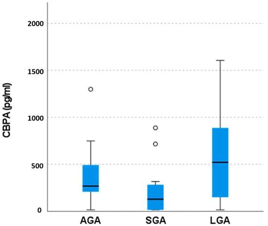 Amniotic fluid BPA concentration levels (CBPA) in the three studied groups (AGA, SGA, LGA) measured in pg/mL. The bold line in the boxes indicates median value, and box limits indicate 25th and 75th percentiles. Whisker plot limits show the extreme values measured in each group (minimum and maximum) excluding outliers (i.e., values more than the 1.5 interquartile range above the upper edge of the boxes). Outliers are designated with a circle. Regarding CBPA in the AGA group median value, 25th and 75th percentiles are 267.82 pg/mL, 206.81 pg/mL, and 503.27 pg/mL, respectively. For the SGA group CBPA median value, 25th and 75th percentiles are 128.62 pg/mL, 15 pg/mL and 299.42 pg/mL, respectively. For the LGA group median value, 25th and 75th percentiles are 520.59 pg/mL, 15 pg/mL and 1022.73 pg/mL, respectively.