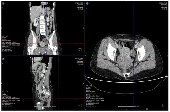 Detailed Case Description. A 47-year-old woman presented herself to the emergency department complaining of diffuse lower abdomen pain, the slowing of intestinal transit, and fatigue. The painful symptomatology affirmatively started about two weeks prior with mild intermittent episodes, which had worsened in the last few hours. The local clinical examination revealed an abdomen with normal adipose panniculus (body mass index = 24.17 kg/m2), mobile with respiratory movements, spontaneously painful in the lower site, with tenderness and slight muscular defense during palpation, especially in the left iliac region. From the patient’s medical history, we noted 3 pregnancies with 3 natural births and high blood pressure treated with Perindopril 5 mg/Indapamide 1.25 mg, one tablet/day. Blood tests did not reveal significant pathological modifications. The patient was admitted to the Surgical Department for further investigation and treatment.