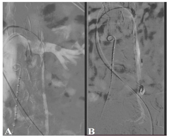 CT-guided endovascular embolization of the left ovarian vein was decided as the chosen therapeutic method. The puncture of the left common femoral vein was performed with the installation of a 5F access sheath. The left renal vein was subsequently catheterized with a Cobra 2 5F catheter and a 0.035″ hydrophilic guide. When injecting into the left renal vein simultaneously with the Valsalva maneuver, reflux was evident in the left ovarian vein, with this having an increased caliber of approximately 1.1 cm. The left ovarian vein was selectively catheterized with a 0.035″ hydrophilic 260 cm guide, later changing the catheter to a vertebral glide 4F, and advanced to the middle third portion of this vein. The control injection showed congested left parauterine veins. The distal portion of the ovarian vein was super-selectively catheterized with a 0.021″ microcatheter, followed by the placement of a 6/20 mm detachable coil (Interlock, Boston Scientific, MA, USA). On the microcatheter placed in the distal portion of the ovarian vein, a mixture of lipiodol and acrylic glue (GLUBRAN®, GEM, Milan, Italy), ratio 1:1, was injected, with the synchronous withdrawal of the microcatheter until the vein was closed (Figure 4). During the control injection in the left renal vein, reflux in the ovarian vein was no longer objectified.