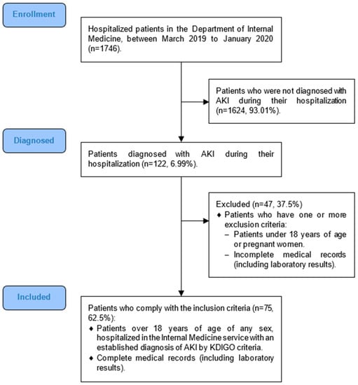 We retrospectively enrolled patients admitted to the Unit of Internal Medicine of the Hospital Civil de Guadalajara Fray Antonio Alcalde (HCG) between March 2019 and January 2020 who were diagnosed with AKI in accordance with the Kidney Disease Improving Global Outcomes (KDIGO) [] guidelines at any time during their hospital stay. Eligible patients were required to have all of the variables of interest in their medical records and a blood and urine sample analysis performed after the AKI diagnosis. Patient demographics, clinical and laboratory data, and outcomes were extracted from patient medical records.