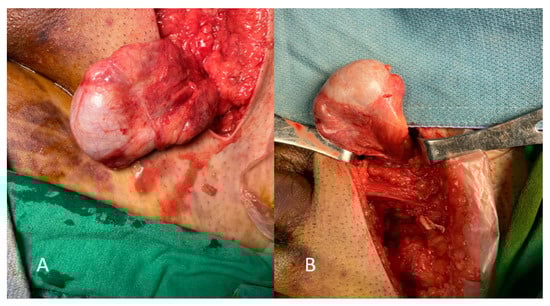 Left testis (A) and right testis (B) during surgery.