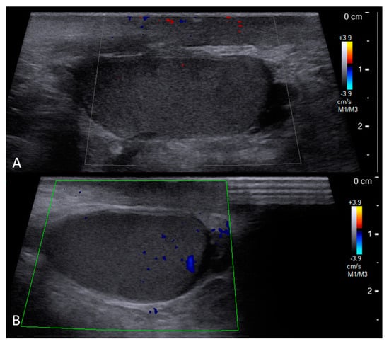 Follow−up scrotal sonography: left testis (A) and right testis (B).
