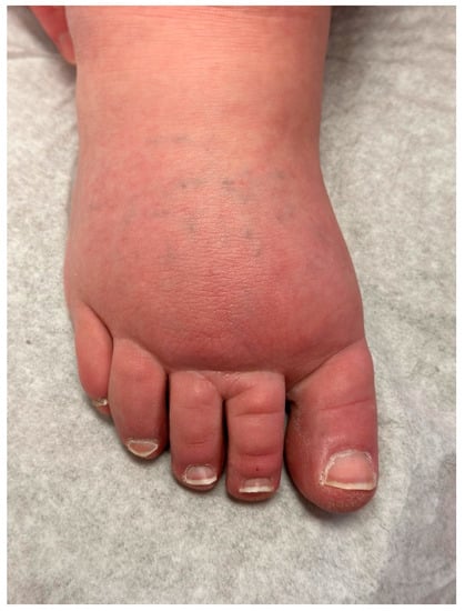 The differential diagnosis for an enlarged, swollen extremity in the absence of obvious injury is wide and may include systemic causes (including cardiac, hepatic, nephrotic, thyroid diseases, hypoproteinemia), venous insufficiency or thrombosis, drug-related (rapamycin inhibitors, antipsychotics, antidepressants, anti-Parkinsonian medications, bisphosphonates), or lipedema [20,21]. Other congenital considerations include vascular anomalies (micro- or macro-cystic lymphatic malformations, capillary or venous malformations, infantile hemangiomas, and Kaposiform hemangioendothelioma), or hypertrophic syndromes (Klippel–Trénaunay, Parkes Weber, and CLOVES) [18,22].