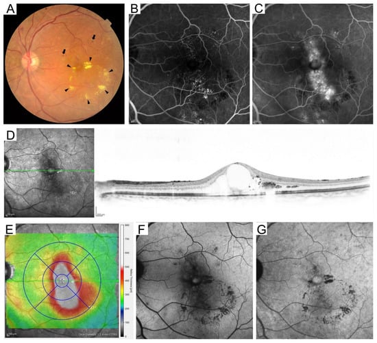Multimodal imaging in a representative case with diabetic macular edema. (A) Retinal hemorrhages (arrows) and hard exudates (arrowheads) in fundus photography. The early (B) and late (C) phases of FA images show fluorescein leakage and pooling. (D) Cystoid macular edema is delineated on the sectional optical coherence tomography (OCT) image obtained using Spectralis OCT along the green arrow on the scanning laser ophthalmoscope image. (E) Two-dimensional OCT thickness map (total retinal thickness) with an ETDRS grid overlay (1, 3, 6 mm-circles). The central subfield thickness is 651 μm. Different OCT machines use different segmentation methods for the outer boundaries of retinas, so the mean retinal thicknesses depend on the OCT machines. (F) Short wavelength fundus autofluorescence. (G) Near-infrared FAF.