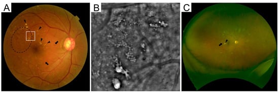There are three main advances in fundus photography: ultrawide field imaging, super high resolution, and separate wavelengths. The clinical application of ultrawide-field fundus photographs has significantly improved the quality of the assessment of peripheral retinas (Figure 2B) []. However, we carefully evaluate the macular lesions, because the lateral resolution is slightly reduced in these indirect images. Adaptive optics technology, which was originally applied to astrology to remove the wavefront aberrations, has increased the lateral resolution of fundus cameras and scanning laser ophthalmoscopes (SLOs) [,]. As a result, we can appreciate the fine structure of vascular lesions, hard exudates, and photoreceptor mosaics (Figure 2C). Since the SLO obtains the fundus imaging, mediated via specific wavelengths of emission and excitation, the light reflection in the SLO images delineates the unusual fundus images. The clinical feasibility of such modalities should be elucidated.