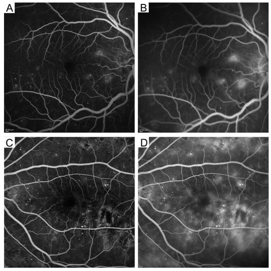 FA has higher sensitivity to detect microaneurysms than fundus examination. Microaneurysms appear to be hyperfluorescent dots and are sometimes accompanied by fluorescein leakage [,]. FA is useful to discriminate microaneurysms from dot-like retinal hemorrhages, which correspond to blocked fluorescence. Circinate hard exudates in fundus examination and microaneurysms with leakage often coexist. When we consider macular photocoagulation for CSME, FA images are useful to determine whether vascular lesions are coagulated.