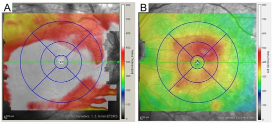Two-dimensional optical coherence tomography (OCT) map. A two-dimensional map with an ETDRS grid overlay (1, 3, 6 mm-circles), which is obtained using Spectralis OCT, allows us to discriminate center-involving diabetic macular edema (CIDME) (A) from non-CIDME (B).