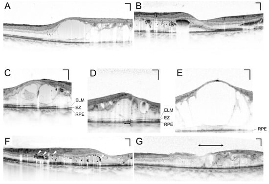 High-resolution images in the outer retinal layers allow us to appreciate the pathological changes in the photoreceptor-retinal pigment epithelium (RPE) complex. SD-OCT delineates the ellipsoid zone (EZ) and the external limiting membrane (ELM) above the RPE [], which are biomarkers of the photoreceptor status. In some cases with DME, one or both of these lines are disrupted or absent at the fovea (Figure 5A–C) [,,,,]. Since VA depends on the foveal photoreceptors in human eyes, their damage leads to VA reduction. The pathological mechanisms underlying photoreceptor damage remain to be elucidated. A recent publication has shown that anti-fumarase antibody is increased in some patients with DME and promotes the photoreceptor inner and outer segments in mice []. This suggests the autoimmune mechanisms in the photoreceptor damage in DME.