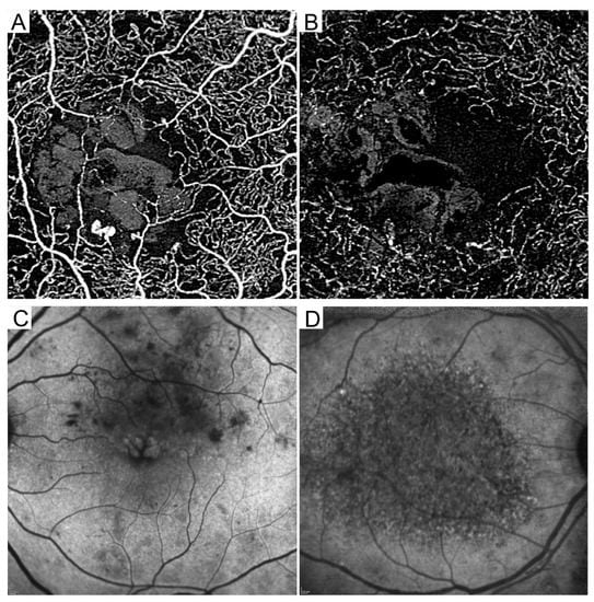 Latest modalities, optical coherence tomography angiography (OCTA) and fundus autofluorescence (FAF). Reduced vascular density in the superficial (A) and deep (B) en-face OCTA images. Scale bar = 200 μm. (C) Oval-shaped hyperfluorescence in short wavelength FAF. (D) Reduced levels of fluorescent signals in near-infrared FAF.