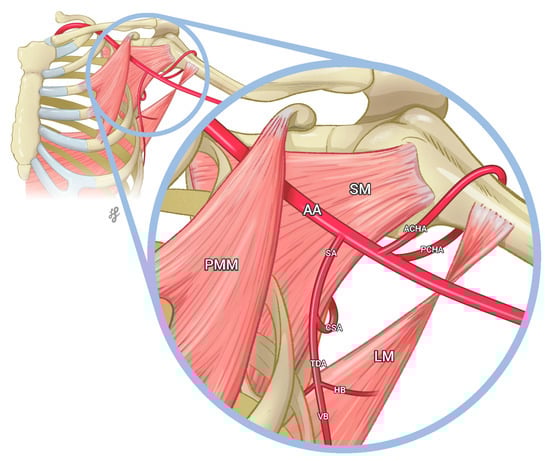 - Thiel, R.; Munjal, A.; Daly, D.T. Anatomy, Shoulder and Upper Limb, Axillary Artery; StatPearls Publishing: Orlando, FL, USA, 2022. [Google Scholar]