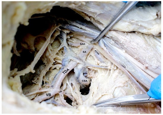 - Banerjee, A.; Kumari, C.; Jhajhria, S.K. Variation in the Branching Pattern of Third Part of Axillary Artery—A Case Report. J. Clin. Diagn. Res. 2017, 11, AD03–AD04. [Google Scholar] [CrossRef]