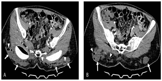 Axial-contrast-enhanced CT scan views (A) and (B) show massive multifocal and confluent nonorganized fluid collections (arrows) with foci of gas (arrowheads) and surrounding fat stranding within subcutaneous adipose tissue of gluteal region bilaterally. Posterior parts of dissected major gluteal muscles are also involved.