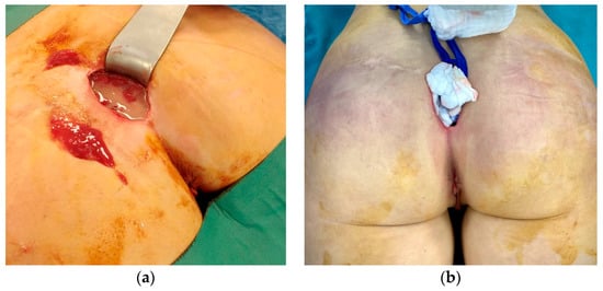 - Matthews, M.R.; Helmick, E.A.; Caruso, D.M.; Foster, K.N. Necrotizing Soft Tissue Infection as a Result of a “Brazilian Butt Lift” Procedure. Trauma Acute Care 2017, 2, 46. [Google Scholar] [CrossRef]