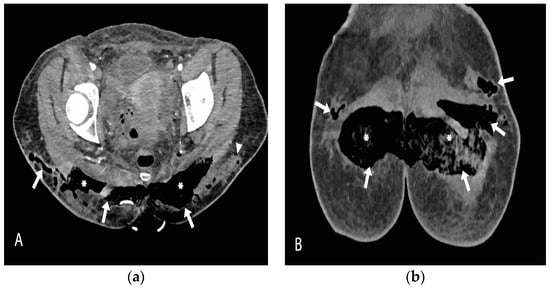 On the day of admission, the patient presented with a high fever (up to 40 °C), tachycardia, tachypnea, and dry cough. Pulse oximetry showed normal oxygen saturation with no need for supplemental oxygen. Laboratory results revealed lymphopenia (1.23 × 109/L), anemia (hemoglobin 112 g/L and red blood cells 3.57 × 1012/L), elevated fibrinogen (7.2 g/L), D-dimer (2.07 g/L), Interleukin-6 (20 pg/mL), lactate dehydrogenase (LDH 781 U/L), ferritin (387 U/L), creatine kinase (CK 212 U/L), and C-reactive protein (CRP up to 253 mg/L) while the neutrophil-to-lymphocyte ratio (NLR) was 3.9. Chest radiography showed normal findings. On physical examination, a dehisced wound with an abundant purulent secretion in the gluteal augmentation surgical site was noted as well as dusky, livid discolored gluteal skin. Additionally, palpation revealed the presence of crepitations in the gluteal region bilaterally. A computed tomography (CT) scan revealed multiple focal and confluent nonorganized fluid collections with foci of gas, fat stranding within the subcutaneous fat of the gluteal region posterior to the gluteal implants, and the posterior parts of dissected major gluteal muscles (Figure 1A,B).