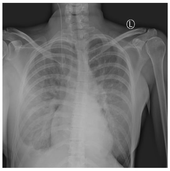 Daily surgical debridement and drainage were performed, and control of the infection was obtained. Regardless of the improvement of the NSTI, in the following days, the respiratory symptoms worsened in terms of dyspnea, with peripheral blood oxygen level measured at 88%. Oxygen therapy was administered with maximum oxygen flow up to 12 L/min, leading to control of oxygen saturation of 96%. A chest radiography revealed signs of progressive bilateral pneumonia with a right-sided pleural effusion (Figure 4). High fever with high-inflammation blood markers persisted hence the antimicrobial therapy was corrected. Tigecycline, Metronidazole, and Fluconazole were administered.