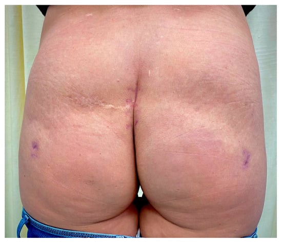 Given the proximity of the anus to the surgical incision, SSIs after gluteal augmentation in the literature are found to be expectedly higher. In a study of 200 patients, Senderoff et al. found the infection rate to be 6.5% for both subfascially and intramuscularly placed implants, while the implant infection rate was 3.8% []. Another systematic review assessing the safety and efficacy of gluteal augmentation found infection rates after solid implant gluteal augmentation to be 1.94%, with implant revision rates of 1.68% and implant removal rates of 0.72%. Risk factors commonly found for SSIs in plastic surgery include older age, female gender, elevated body mass index (BMI), tobacco smoking, diabetes mellitus, and most importantly, an immunocompromised status [,]. Our patient, being a nonsmoking, young, otherwise healthy woman, had no common risk factors for SSIs after gluteal augmentation or for the more severe NSTI commonly associated with the immunocompromised and the elderly. No complications were reported by the patient regarding her previous breast augmentation surgery. Severe complications such as life-threatening NSTIs after gluteal augmentation have been described in the literature only as individual reports. One patient had gluteal augmentation with fat transfer, while two of the three reported patients found had gluteal augmentation with solid silicone implants. In one patient, pregnancy was found as the cause of immunosuppression; the other patient’s medical history was undisclosed [,,].