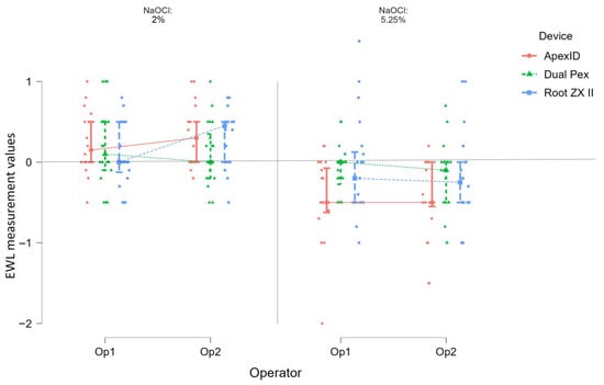 Means and standard deviations of the values obtained, after calculating the differences among ACL and EWL readings obtained by Op1 and Op2 for each EAL and for the two concentrations of NaOCl solutions, are presented in Table 2.