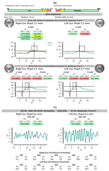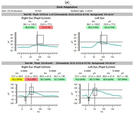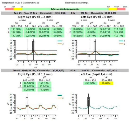 Electroretinography (ERG) is an objective measure of retinal function, in which changes in electrical polarization are graded depending on the duration and intensity of the light stimulus []. Rod-driven and cone-driven retinal responses can be differentiated based on specific light and dark adaptation levels [,]. Full-field ERG (ffERG) is a type of ERG that facilitates diagnosis and prognosis assessment in retinal disease. It measures an electrical response from the entire retina, and not just the macular area. Moreover, in patients with localized retinal disease, ffERG results are normal, as reported for various macular diseases []. Therefore, the diagnostic test of choice in patients with macular disease is multifocal ERG (mfERG). Numerous studies have confirmed that mfERG is a useful tool for monitoring the disease and treatment outcomes [].