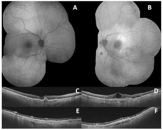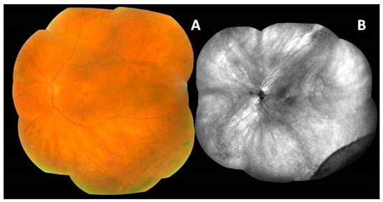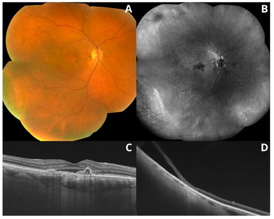 So far, AMD has been generally considered a disease of the central retina, that is, the macula. However, recent studies have shown that, apart from the macular area, AMD may also affect the peripheral retina. Several studies have confirmed that peripheral retinal lesions are more common in patients with AMD than in healthy individuals, as assessed by ultrawide-field imaging and optical coherence tomography [,,]. Moreover, these changes seem to be more frequent in eyes with late AMD (neovascular AMD and/or geographic atrophy). However, the relevance of these peripheral lesions has not been elucidated [,]. Example images of peripheral retinal degeneration and retinoschisis in patients with AMD are shown in Figure 2 and Figure 3. Peripheral drusen and perivascular pigmentation are depicted in Figure 4.