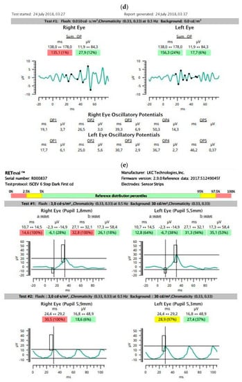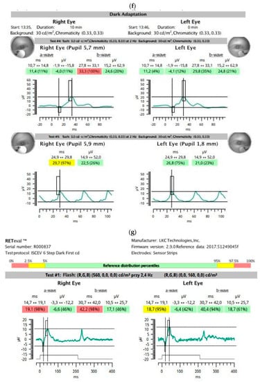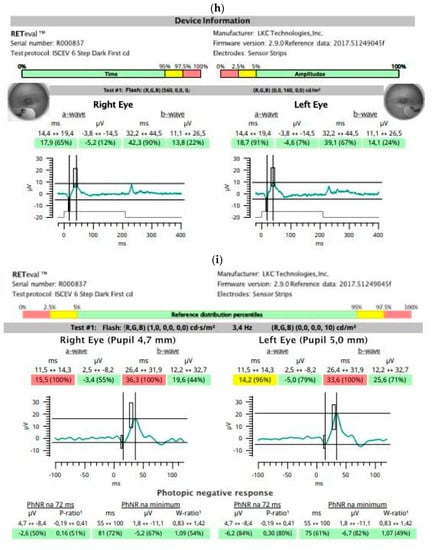 - Robson, A.G.; Frishman, L.J.; Grigg, J.; Hamilton, R.; Jeffrey, B.G.; Kondo, M.; Li, S.; McCulloch, D.L. ISCEV Standard for full-field clinical electroretinography (2022 update). Doc. Ophthalmol. 2022, 144, 165–177. [Google Scholar] [CrossRef]