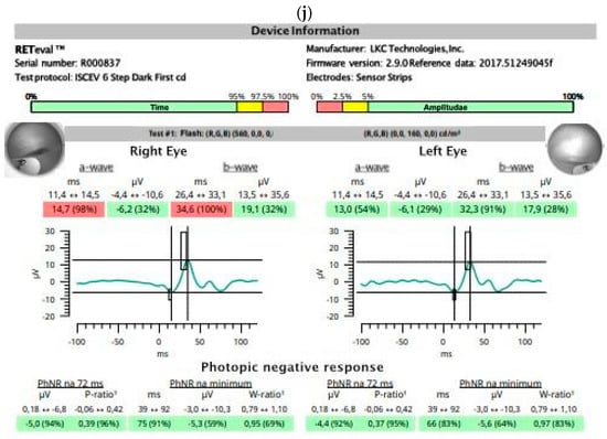 A 74-year-old woman with neovascular age-related macular degeneration (AMD) of the right eye (RE) and dry AMD with numerous drusen in the macula of the left eye (LE). Previously, macular degenerations were similar in both eyes. Best corrected visual acuity (BCVA): RE = 0.1 and LE = 1.0. ffERG (RETeval, LKC Technologies, Gaithersburg, MD, USA, sensor strip electrodes) before and after 4 anti-vascular endothelial growth factor injections into the RE. Follow-up at 8 months. BCVA after treatment: RE = 0.125 and LE = 1.0. Scotopic ffERG was abnormal in the RE before treatment (a) with little improvement after treatment (b). The amplitudes of oscillatory potentials were low in both eyes before and after treatment (c,d). On photopic ffERG, markedly prolonged a-wave and b-wave implicit times were noted in the RE; a-wave and b-wave amplitudes were low in the RE before treatment (e) and were low in both eyes at follow-up (f). After treatment, the amplitudes became higher in the treated eye and lower in the fellow eye. The function of ON-center and OFF-center bipolar cells was similar in both eyes before treatment (g) and did not change after treatment (h). The photopic negative response revealed normal retinal ganglion cell function in both eyes before (i) and after (j) treatment. ffERG findings were abnormal in both eyes, but a significantly prolonged implicit time of a-wave and b-wave was noted in the RE only.