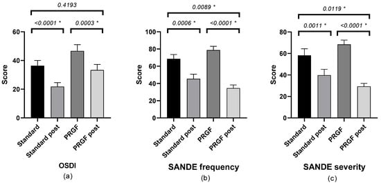 Mean and SEM of the SANDE severity questionnaire when baseline OSDI was mild (a), moderate (b), and severe (c), initially and after treatment (post) in the standard and PRGF groups. * Statistically significant difference (p < 0.05).