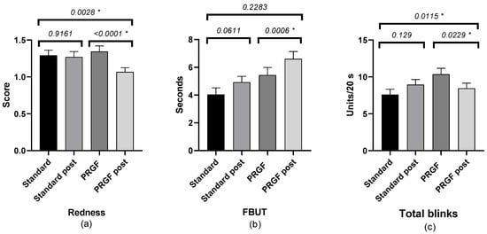 Mean and SEM (Standard Error of Mean) of ocular redness: (a) FBUT, (b) number of total blinks, and (c) initial and after treatment in the standard and PRGF groups. * Statistically significant difference (p < 0.05).