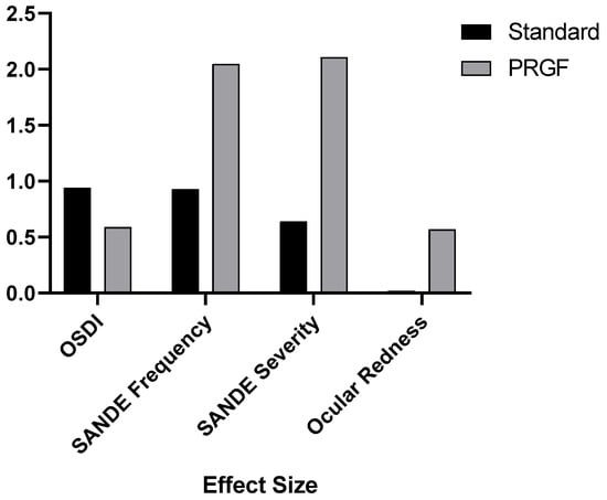 Figure 4 shows how the addition of PRGF affected the variables analyzed by the effect size. It was observed that the effect size was significantly larger for the SANDE symptomatology and ocular redness questionnaires.