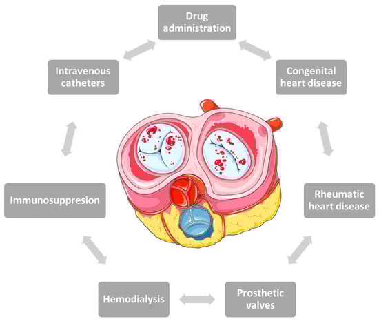 In the past, the most common causes of IE in young people were rheumatic heart disease or congenital heart disease. Advances in technology have led to changes in the panel of predisposing factors over time, with age, frailty or the presence of comorbidities increasingly being blamed instead of prosthetic valves, hemodialysis, intravenous catheters or immunosuppression [,] (Figure 1).