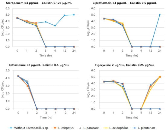 Time–kill assay results demonstrated that Lactobacillus spp. culture extracts had an antimicrobial effect on MRAB. The species that exhibited the best antimicrobial effect was L. paracasei, which also exhibited the fastest and most sustained antimicrobial activity. Lactobacillus plantarum also exhibited a superior antimicrobial effect relative to other species against ST191 and ST451 when combined with tigecycline and colistin. Notably, complete inhibition against ST191 was observed, whereas a partial inhibitory effect against ST451 was demonstrated with inhibition sustained for up to 12 h after incubation, followed by the re-growth of MRAB.