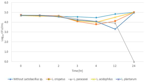 In addition, culture solutions containing four Lactobacillus spp. were used to elucidate their antimicrobial effect using the following procedure: Lactobacillus spp. culture solution was incubated on MRS agar (BD Difco, USA) for 24 h, after which, incubated Lactobacillus spp. were adjusted using the McFarland standard 4.0. Subsequently, a 0.45 µm syringe membrane filter (Merck Millipore, Burlington, MA, USA) was used to filter out solid components and 20 µL was added to bring the volume of the reaction solution to 200 µL. MRS broth contains sodium acetate, which decreases its pH to inhibit the growth of other bacteria. To differentiate from the low-pH culture solution produced by Lactobacillus, brain-heart infusion broth (BD Difco, USA) was used as the dilution solution in all experimental procedures. Subsequently, the mixed broth was incubated at 37 °C for 0, 1, 2, 3, 4, 12, and 24 h, after which, the number of bacterial cells was counted [23,24].