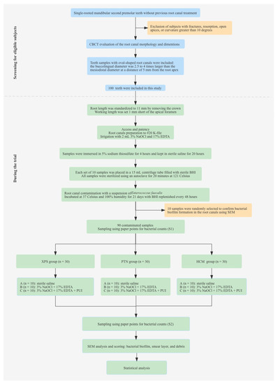 Flow diagram showing the selection of eligible subjects and the conduction of the trial. Abbreviations: BHI: brain heart infusion broth; CBCT: Cone-beam computed tomography; HCM: HyFlex CM; PTN: ProTaper Next; PUI: passive ultrasonic irrigation; SEM: scanning electron microscope; XPS: XP-endo Shaper.