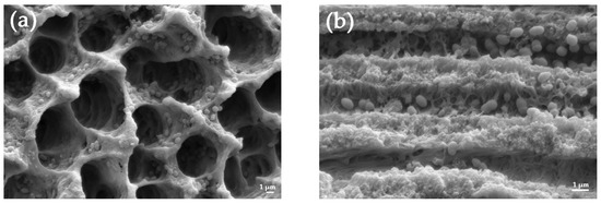 Representative scanning electron microscopy (SEM) images of E. faecalis colonization of the root canal before chemomechanical instrumentation. (a) A transverse section of dentinal tubules (3000×); (b) A longitudinal section of dentinal tubules (7000×). Bar = 1 μm.