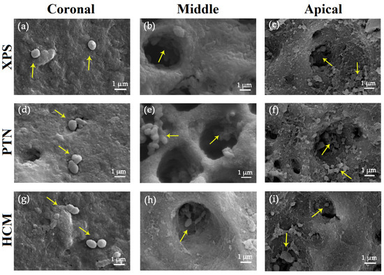 Representative SEM images of the buccolingual canal walls after rotary instrumentation in the coronal, middle, and apical thirds. The images were taken at a magnification of 5000×, and yellow arrows indicate bacteria residue. In the whole group, only isolated bacteria were observed on the canal wall surface in the coronal thirds (a,d,g). In all groups, bacterial residue on the buccolingual canal walls in the coronal and middle thirds were lower than the apical third. In the middle third, a few agglomerating bacteria with signs of viability were observed in the dentinal tubules of all three groups (b,e,h), whereas in the apical third, the bacterial density was higher, with more agglomerating bacteria in the tubules (c,f,i). Bars = 1 μm. Abbreviations: HCM: HyFlex CM; PTN: ProTaper Next; SEM: scanning electron microscope; XPS: XP-endo Shaper.