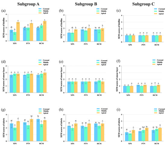 The bar charts showing SEM scores of bacterial biofilms (a–c), smear layer (d–f), and hard tissue debris (g–i) on the buccolingual walls of the root canal in the coronal, middle, and apical thirds, after chemomechanical preparation with different irrigants and rotary systems. (a,d,g) Subgroup A: Sterile saline; (b,e,h) Subgroup B: 3% NaOCl and 17% EDTA; (c,f,i) Subgroup C: 3% NaOCl, 17% EDTA, and PUI. Different lowercase letters indicate a significant difference at p < 0.05. Abbreviations: HCM: HyFlex CM; PTN: ProTaper Next; PUI: passive ultrasonic irrigation; SEM: scanning electron microscope; XPS: XP-endo Shaper.