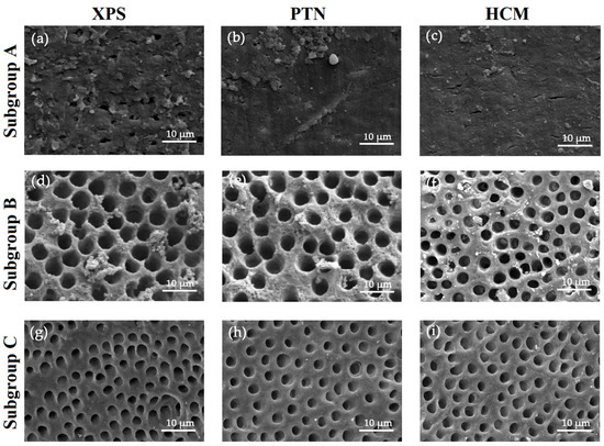 Representative SEM images showing smear layer on the buccolingual canal walls in the coronal third after chemomechanical preparation with different irrigants and rotary systems. (a–c) Subgroup A: Sterile saline; (d–f) Subgroup B: 3% NaOCl and 17% EDTA; (g–i) Subgroup C: 3% NaOCl, 17% EDTA, and PUI. The images are magnified at 1000×. Bars = 10 μm. Abbreviations: HCM: HyFlex CM; PTN: ProTaper Next; PUI: passive ultrasonic irrigation; SEM: scanning electron microscope; XPS: XP-endo Shaper.