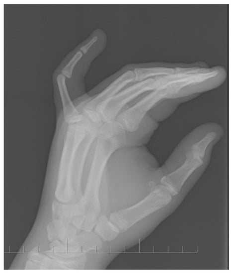 - Dy, C.J.; Swarup, I.; Daluiski, A. Embryology, diagnosis, and evaluation of congenital hand anomalies. Curr. Rev. Musculoskelet. Med. 2014, 7, 60–67. [Google Scholar] [CrossRef]
