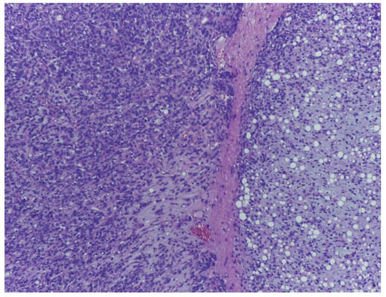 Moreover, a prominent vasculature, formed by delicate arborizing capillaries with a plexiform arrangement, was identified. The tumour lobules were surrounded by a rim of atypical lipoblasts. The malignant tumour proliferation displayed abrupt transition towards a divergent component (Figure 3) consisting of highly pleomorphic tumour cells with atypical mitotic figures, with associating small necrotic and haemorrhagic areas (Figure 4, Figure 5 and Figure 6).