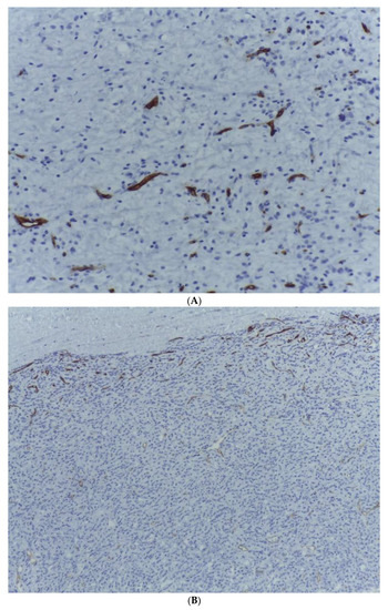 (A) CD34 staining highlighting the prominent “chicken-wire” capillary network within the lipogenic tumour area. HE, ob. 200×. (B) Tumour cells within the dedifferentiated tumour component are negative for CD 34. Immunohistochemical staining also demonstrates a delicate arborizing vasculature present within the outer limits of the proliferation. CD 34, ob. 100×.